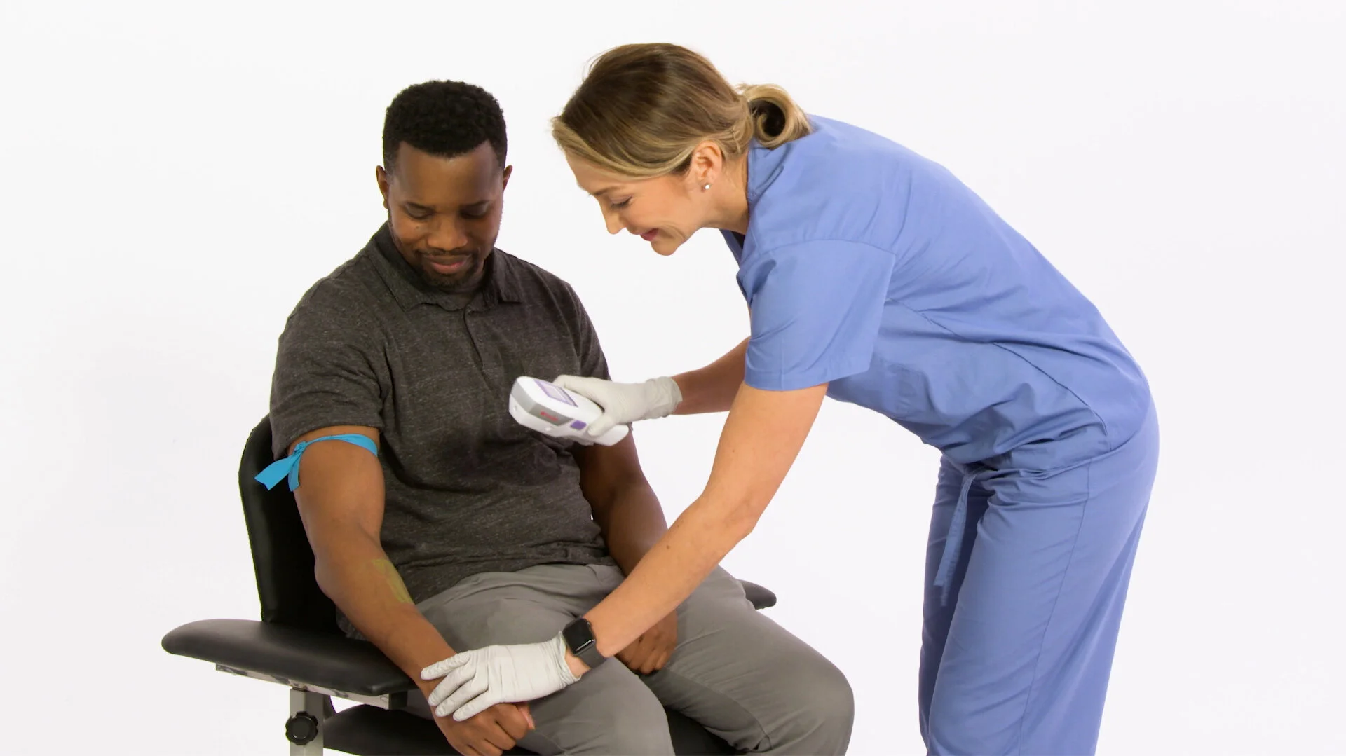 Ironbound worked with AccuVein to identify a group of actors who both fit the demographic of their product’s use and who had veins that would show up on camera. After casting, Ironbound set up a single shoot day that could accommodate filming demos with all of the actors, a spokeswoman, and product shots for b-roll.